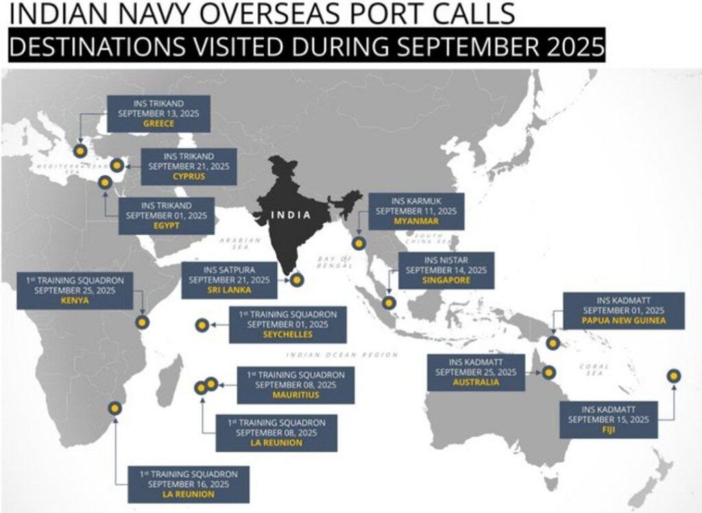 भारत की बढ़ती नौसैनिक कूटनीति सितंबर 2025 में स्पष्ट रूप से देखी गई, जब भारतीय नौसेना ने सद्भावना बंदरगाह यात्राओं, हिंद महासागर मिशनों और भूमध्यसागरीय क्षेत्र में अपनी उपस्थिति को मजबूत किया। यह महीना भारतीय नौसेना के लिए एक महत्वपूर्ण मील का पत्थर साबित हुआ, जिसमें भारत की वैश्विक गतिविधियों को एक नई दिशा मिली।